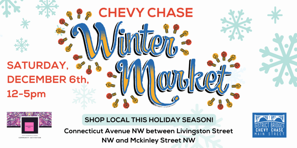 Home Events - District Bridges Community Event DC Holiday Hunt Chevy Chase Winter Market Chevy Chase Winter Market Share this post Participation Opportunities Support this event Key Information Date Dec 06 2025 Time 12:00 pm - 5:00 pm Main Street Chevy Chase