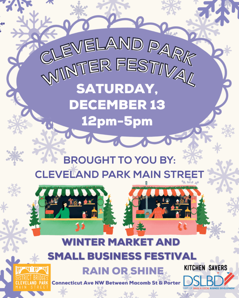 Home Events - District Bridges Community Event DC Holiday Hunt Cleveland Park Winter Market & Small Business Festival Cleveland Park Winter Market & Small Business Festival Share this post Participation Opportunities Support this event Key Information Date Dec 13 2025 Time 12:00 pm - 5:00 pm Main Street Cleveland Park Location Cleveland Park Promenade